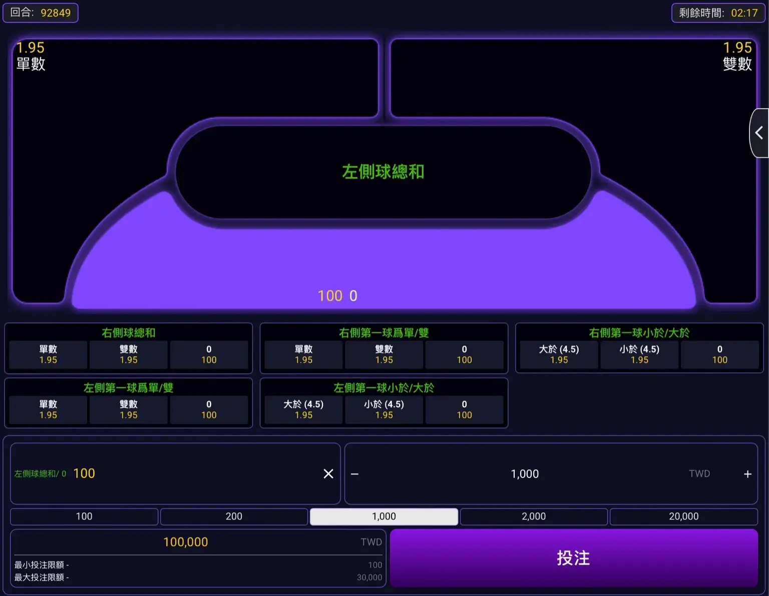- 賽道為 雙賽道模式,以終點的 球號總和、單雙、大小 判定輸贏。